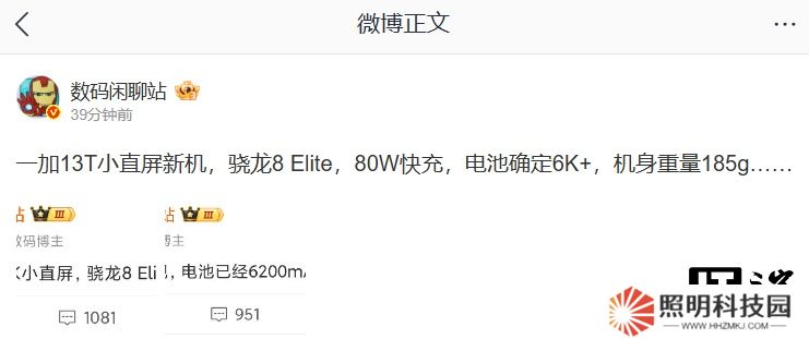 博主@數碼閑聊站 今日發文透露,一加 13T 手機將搭載驍龍 8 Elite 處理器、支持 80W 快充。同時新機電池容量確定超 6000mAh、機身重量 185g。