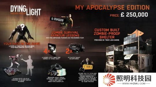 這個《消逝的光芒》典藏版包含許多贈品,其中就包括:將購買者的臉掃描后放入游戲永久保存、等身大小的怪物雕塑、“僵尸生存”跑酷課程、夜視儀,前往Techland參觀的全額往返旅行和簽名版本的4份游戲。