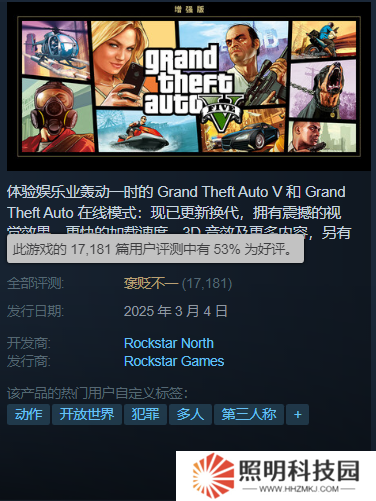 目前在Steam平臺(tái),《GTA5》PC次世代版本(官方名稱《GTA5 增強(qiáng)版》),僅僅只有53%的好評(píng)率,為系列最低。這項(xiàng)數(shù)據(jù),甚至不如此前外包團(tuán)隊(duì)開發(fā)的《GTA三部曲》。