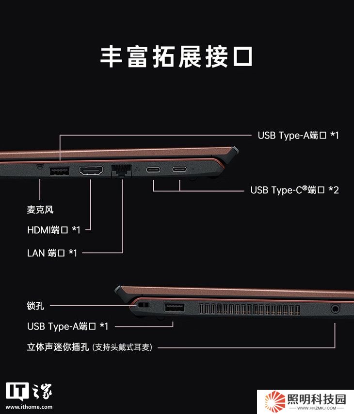 I/O方面,該機左側配備1個 USB-A 接口、1個 3.5mm 音頻接口;右側配別1個 USB-A接口、1個 HDMI接口、1個 RJ45網口、2個 USB-C接口。