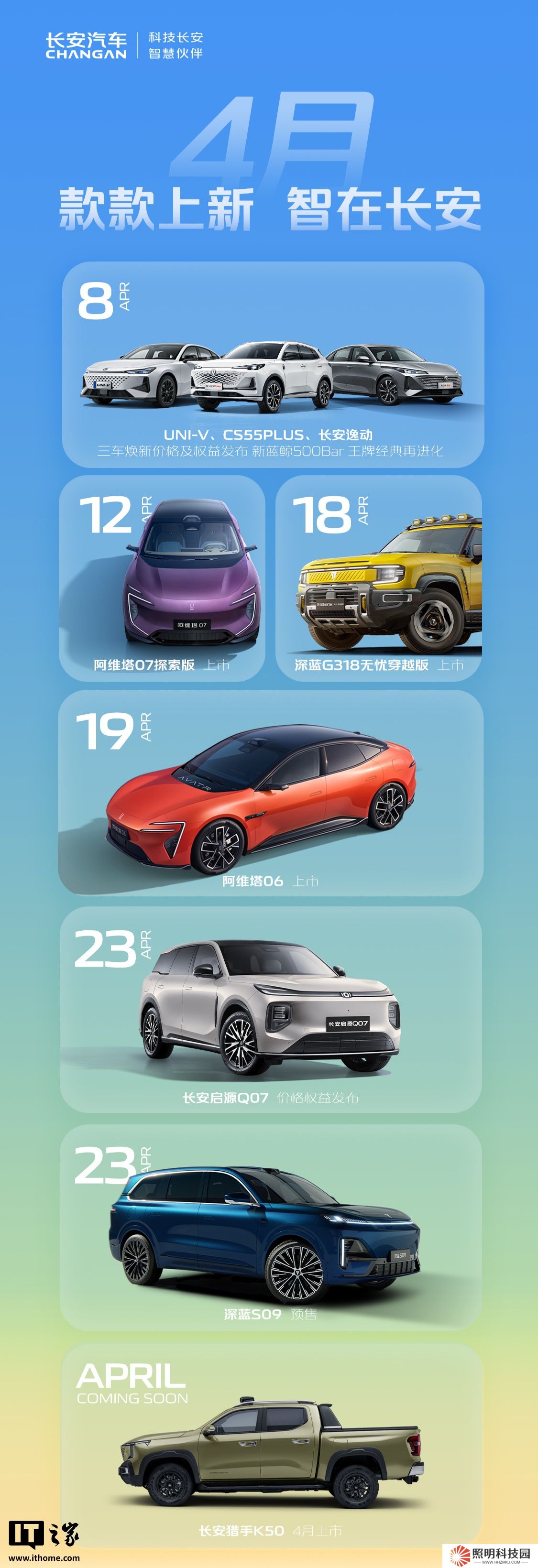本站 4 月 8 日消息,長(zhǎng)安汽車官方今日公布了 4 月新品計(jì)劃,含阿維塔 06 / 07 探索版、啟源 Q07 等 9 款車型。