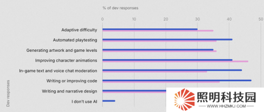 根據調查,即便接受度日益增高,整個行業的 AI 使用率依然比較穩定。實際上 AI 的部分使用,例如在“自適應難度”方面的使用有所下降。不過在其他領域,例如游戲測試方面則略有增加。