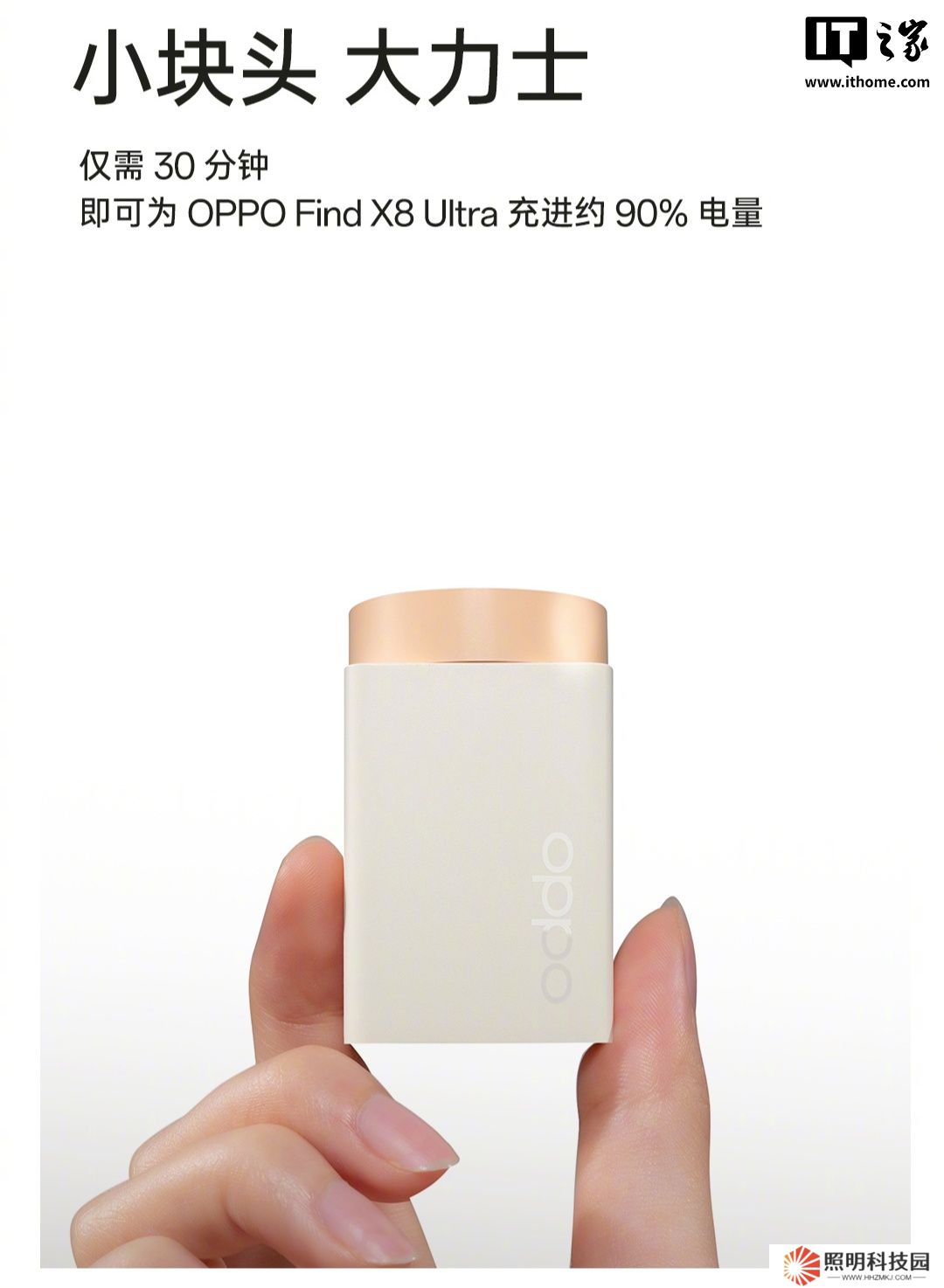 據介紹,OPPO 100W 小方瓶超級閃充氮化鎵充電器用時約30 分鐘可為 OPPO Find X8 Ultra 手機充進約 90% 的電量。