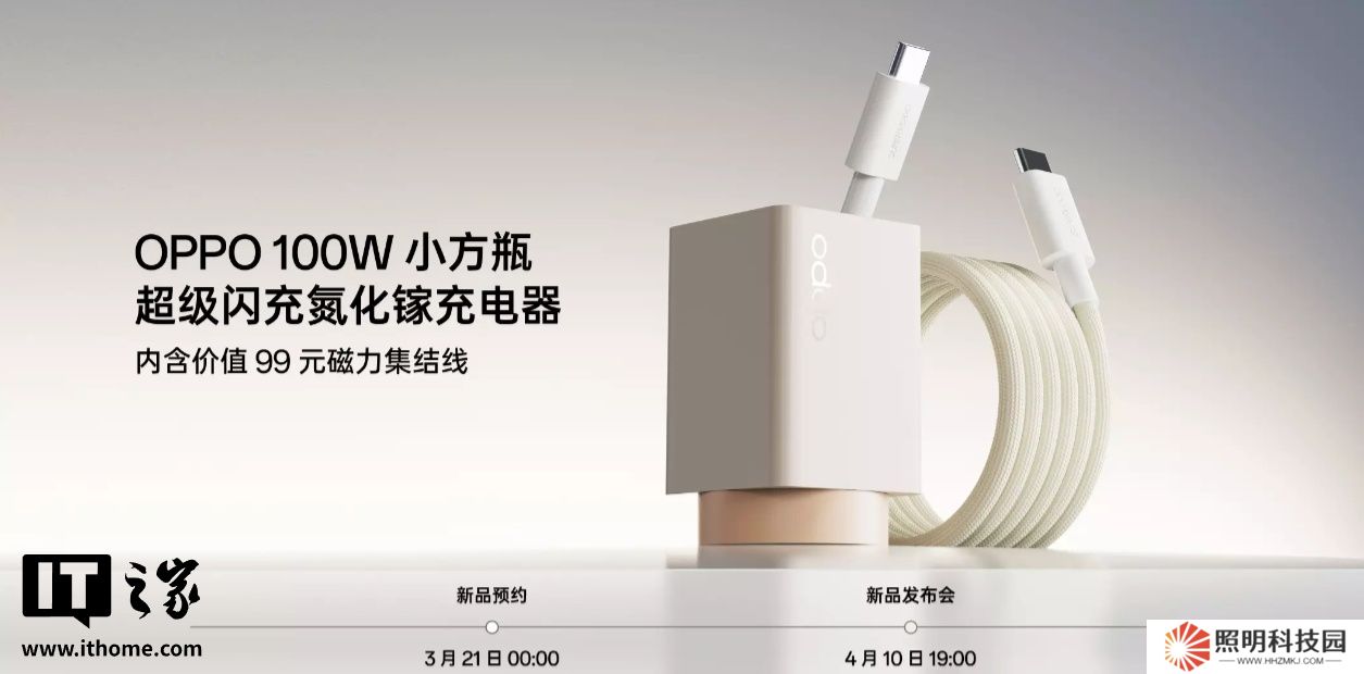 本站 4 月 8 日消息,OPPO 100W 小方瓶超級閃充氮化鎵充電器今日開啟預熱,新品采用“前圓后方”的設計,可配合磁力集結線使用,4 月 10 日發布。