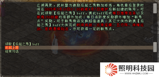 1、3月18日后未登錄新服【騰蛇踏淵】的大俠或活動(dòng)開(kāi)始后創(chuàng)建的新角色,等級(jí)≥135級(jí)時(shí)可在江湖接引使處領(lǐng)取【后起之秀】BUFF享受50%技能經(jīng)驗(yàn)加成與雙倍俠義賞獎(jiǎng)勵(lì),領(lǐng)取每日活躍獎(jiǎng)勵(lì)時(shí)候?qū)@得新秀令。