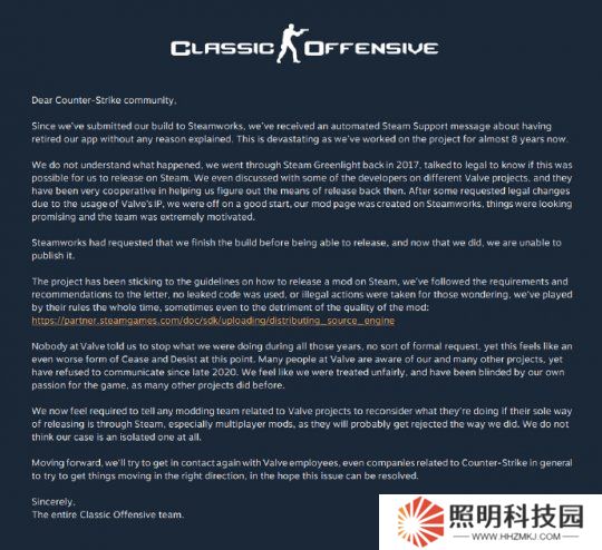 然而,這有可能只是開發(fā)者的一廂情愿。V社對《CS》玩家自制mod的上線,并未表明過開放態(tài)度。今年1月份,一款花費了8年時間開發(fā)的《CS:GO》經(jīng)典攻勢mod,就在上線前夕被喊停。