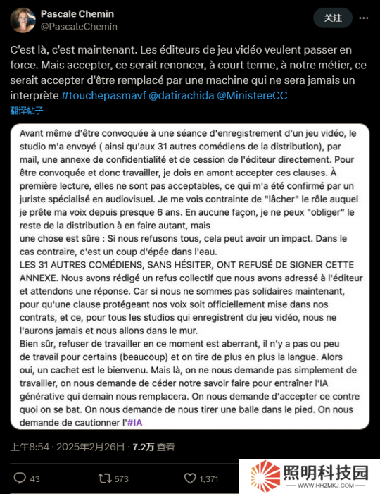 而她的同事顯然選擇了站在她這一邊,Chemin 繼續寫道:“其他 31 名配音演員毫不猶豫地拒絕了簽署這份協議。我們寫了一封集體拒絕信,發給了發行商,正在等待回復。如果我們現在不團結起來,將保護我們聲音地條款正式添加到我們的合同中——不只是我們,而是每個電子游戲配音工作室——我們將永遠得不到一個(公正的協議),我們將走向災難?!?/p>