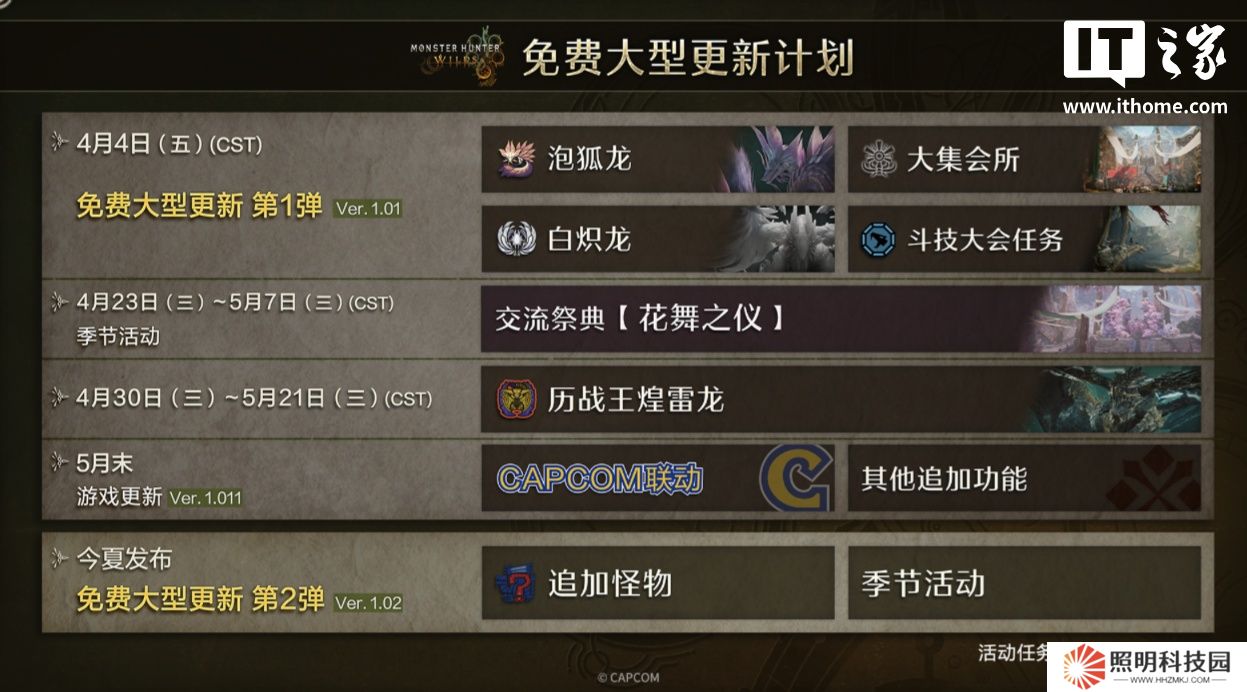 本站 4 月 3 日消息,《怪物獵人:荒野》第一彈免費大型更新(1.010.00.00)將于明日 11:00 正式上線,卡普空剛剛在官網發布了此次更新說明。本站翻譯如下: