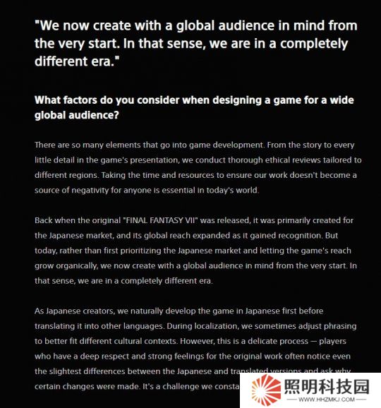 當最初的《最終幻想7》發售時,它主要是為日本市場打造的,隨著它的知名度不斷提高,其全球影響力也不斷擴大。但今天,我們不再優先考慮日本市場,讓游戲的影響力自然而然地增長,而是從一開始就考慮到全球受眾。從這個意義上說,我們處在一個完全不同的時代。