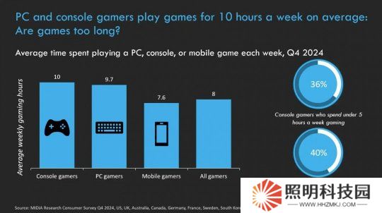 研究顯示40%的PC玩家每周玩游戲的時間少于5小時,而主機玩家的游戲時間略高于PC玩家:39%的主機玩家每周游戲時間為10小時,36%的主機玩家每周游戲時間不足5小時。三分之二的PC和主機玩家每周游戲時間不足10小時。