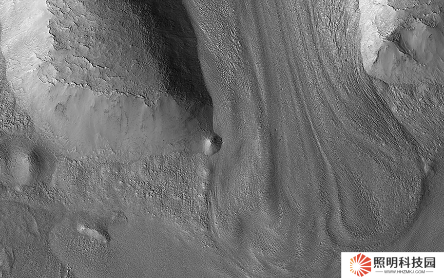 冰川狀地貌 —— 在兩個山脊間,大量物質似乎曾向下流動,形成冰川狀地貌(Glacier-like features),這暗示火星中緯度地區過去可能存在冰層堆積。圖片來源:美國國家航空航天局 /噴氣推進實驗室-加州理工 / 亞利桑那大學