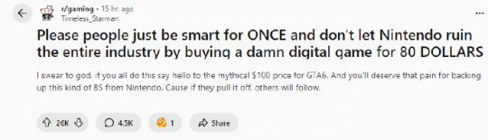 在外網Reddit論壇,最近就有玩家發起呼吁:“請大家明智一點,不要讓任天堂80美元的游戲定價毀掉整個行業!”網友們認為,如果這次大家妥協了,那么未來就將面臨100美元的《GTA6》。因為任天堂的成功,會讓同行們效仿。