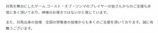 彼時的眾籌目標為500萬日元,但在當天便超額完成了任務!后續大伙不斷加碼,總計有2014人進行了捐贈,并取得了2710萬日元的眾籌金??恐@筆錢,和多都美神社順利完成了重建,官方為此還特別鳴謝了《對馬島之魂》的玩家。