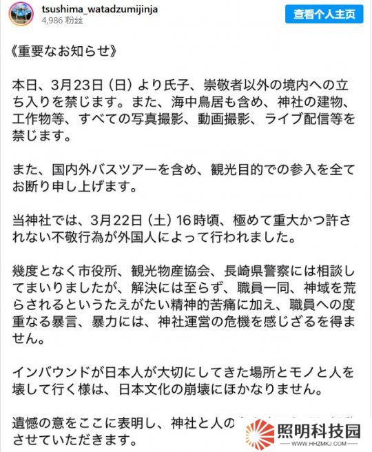 而在本次的官方公告中,限制進入的范圍擴大到了全體游客,“所有以觀光為目的的進入都將被拒絕”。理由則是因為觀光的游客太多,導致了場景被破壞。個別游客,甚至還對神職人員進行了謾罵和暴力行為。