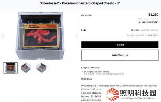 這款薯片為火辣味奇多薯片,顏色火紅、形狀神似噴火龍。在拍賣網站Goldin上,許多《寶可夢》玩家競相報價,最終競拍價格已超過4000美元(約合人民幣2.9萬元)。因為超高的價值,這塊薯片被放置在一個定制的盒子中收藏。