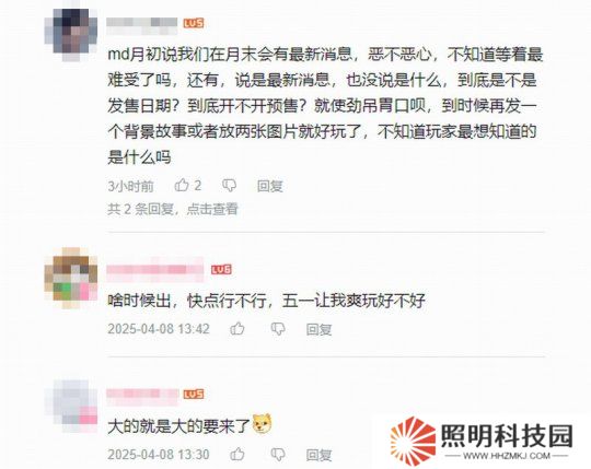 評(píng)論區(qū)有許多玩家表示很期待,有人猜測(cè)是4月25日公布消息,因?yàn)槌绲澗褪窃谀翘熳钥O的。還有人稱官方宣發(fā)吊胃口,趕緊公布發(fā)售時(shí)間。有玩家說:“預(yù)購什么時(shí)候開始?能不能五一讓我爽玩!”