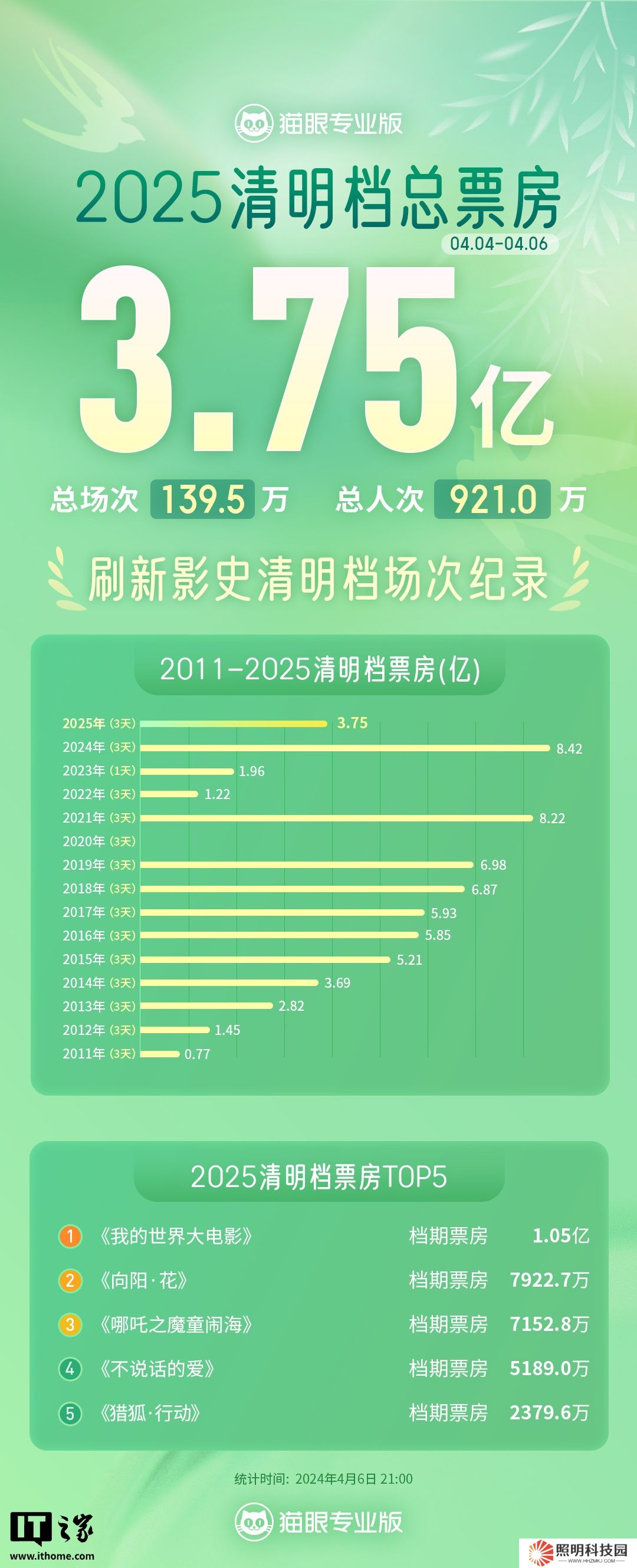 本站注意到,截至 4 月 6 日 21 時,2025 清明檔總票房 3.75 億、總人次 921.0 萬、總場次 139.5 萬,刷新中國影史清明檔場次紀錄。清明檔票房 TOP5 如下: