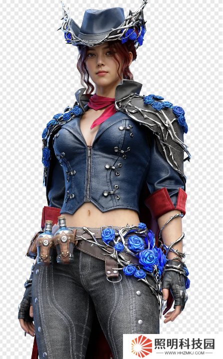 包裹緊致的藍(lán)黑色貼身皮革,在優(yōu)雅中顯出性感。糾纏在藤曼中的藍(lán)玫瑰與點(diǎn)綴的紅絲巾相互映襯,打造一身瀟灑又利落的造型。