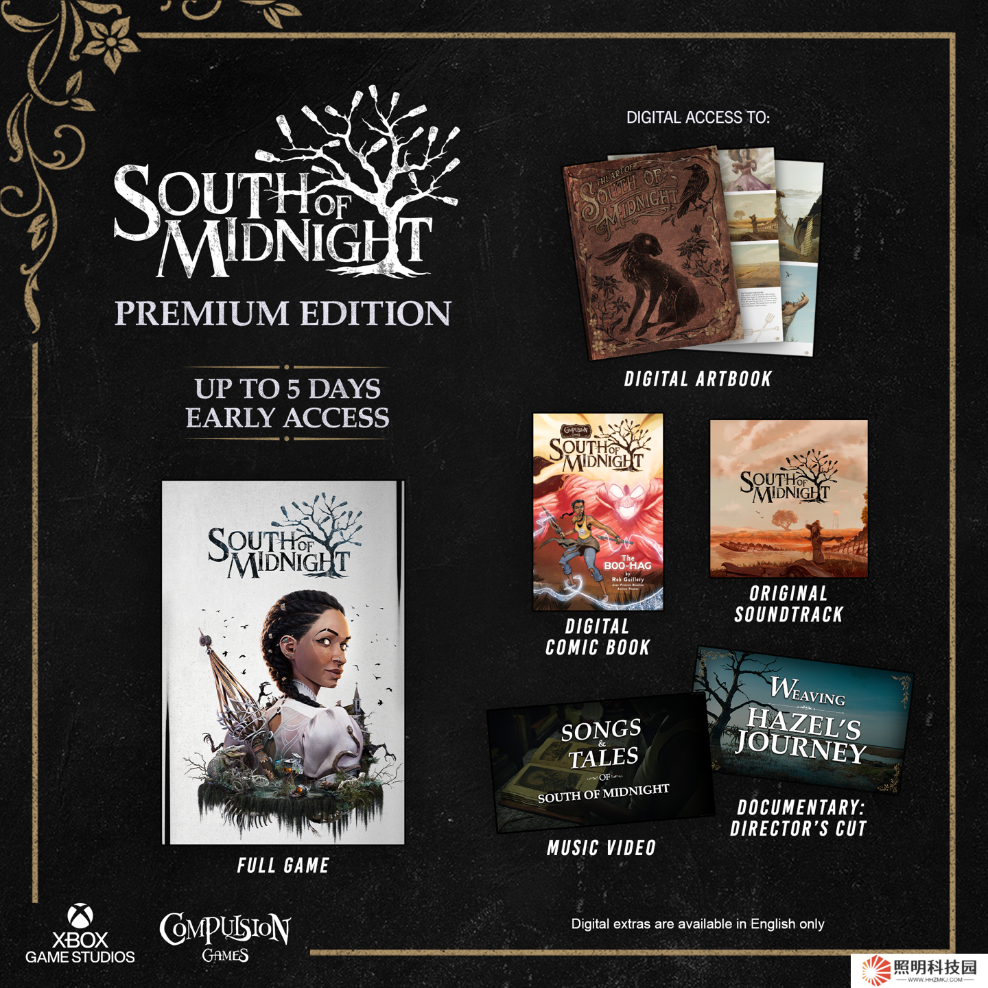除了游戲本體之外,《午夜之南》高級(jí)版還附帶一本數(shù)字藝術(shù)畫冊(cè)、一本數(shù)字漫畫書、游戲原聲音樂(數(shù)字版)、一段音樂視頻以及一部關(guān)于該游戲的紀(jì)錄片。