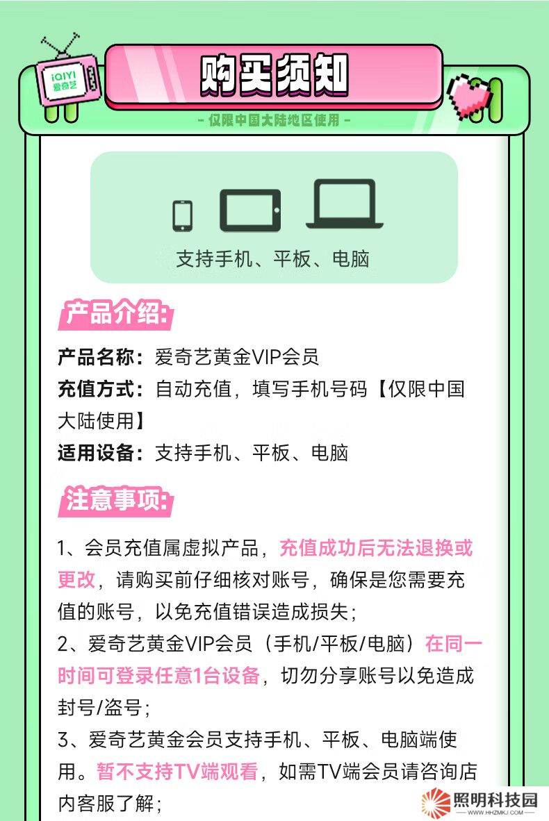 愛奇藝黃金VIP 會員在同一時間可登錄任意 1 臺設備,支持手機、平板、電腦端使用(不支持 TV 端)。