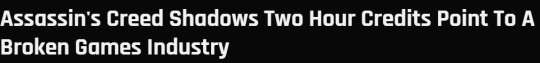 ·根據(jù)對過去發(fā)售的主流游戲通關謝幕作比較,上一部育碧大作《刺客信條:幻景》約50分鐘,這回直接翻倍,其他公司的大作比如《最后的生還者2》16分鐘,《賽博朋克2077》40分鐘,本次的《刺客信條:影》算是刷新了史長新紀錄。