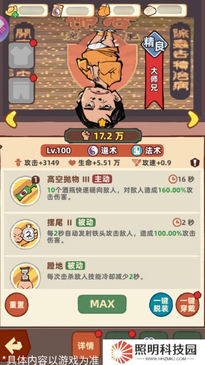 大師兄的主動技能可以在場地中丟出10個酒瓶,對選中的敵人造成傷害;被動技能可以增加大師兄的輸出頻率,并且擊殺敵人后會使兩個技能的冷卻時間減少,增加技能釋放的頻率;各位大俠可以在前期使用大師兄來進行過度;
