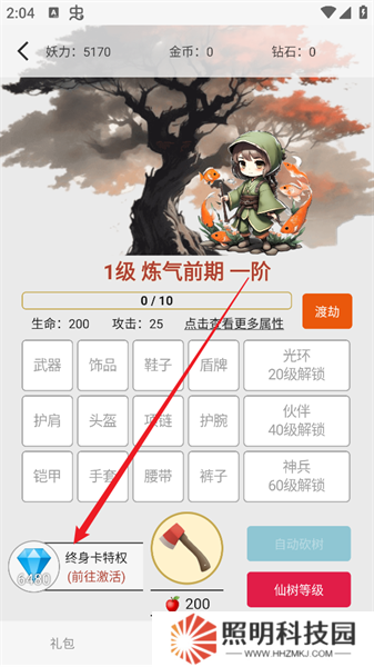 2、然后你就能夠開始進行自己的砍樹尋道之旅,點擊左下角的終身卡。