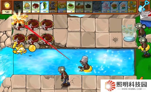 4、最后可以看到植物卡槽上指定植物的消耗減少了50