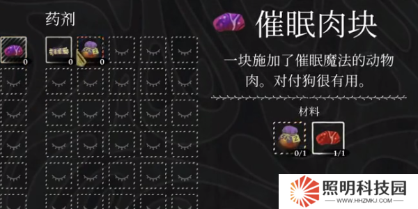 1、想要獲取到狗毛就必須首先使用催眠肉塊讓它失去行動能力,所需的材料是一個催眠藥水以及肉塊。