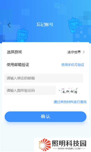 4、忘記賬號的話,你需要點擊后先選擇迷你世界游戲,要是記得迷你號所綁定的手機號碼,可以輸入手機號后再輸入驗證碼并點擊確認。