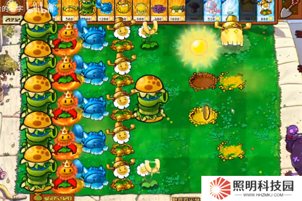 2、在僵尸出現之前,要在場地上種植出漢堡射手、向日葵女王、冰瓜香蒲、至尊VIP堅果以及寶藏吞噬者,然后就能夠掛機度過前期。