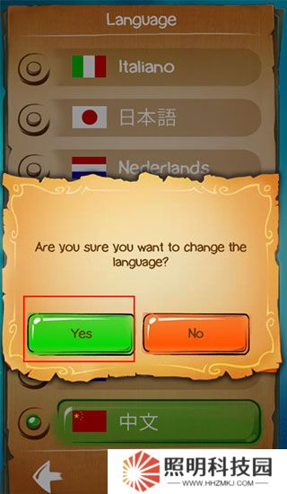 4、點(diǎn)擊中文的選項(xiàng),并在彈窗之中點(diǎn)擊“yes”確定。