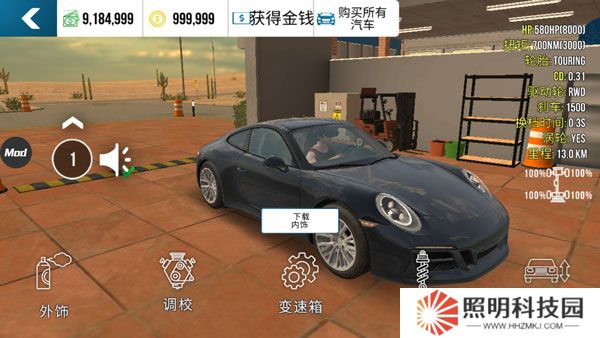3、點(diǎn)擊“停車房”選項(xiàng),在這里瀏覽并選擇不同的車輛,同時(shí)還可以根據(jù)個(gè)人喜好更換賽車配件,提升車輛性能。