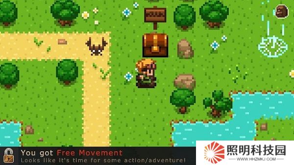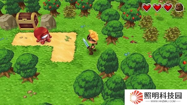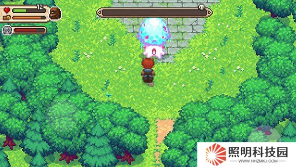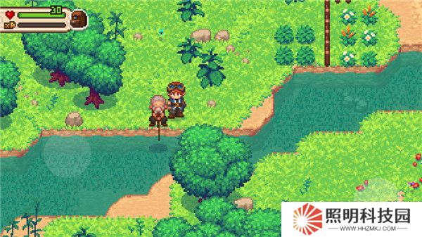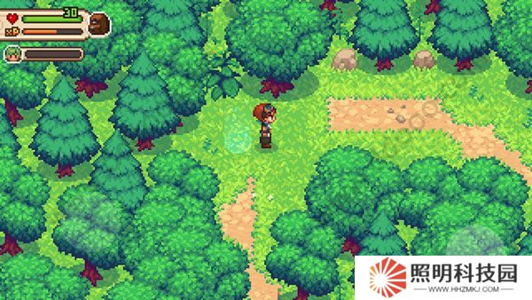 在沒有武器的情況下路上的灌木叢會(huì)擋住你的去路,有武器時(shí)只需點(diǎn)擊攻擊鍵就可以擊毀灌木叢,在擊毀灌木叢后有幾率掉落補(bǔ)血的紅心和金幣,屏幕左上角綠色條是生命值,底下的黃色條是經(jīng)驗(yàn)值,擊殺怪物后獲得大量經(jīng)驗(yàn)值升級(jí),在森林中如果遇到寶箱一定要面對(duì)寶箱點(diǎn)擊攻擊鍵打開寶箱,可能會(huì)獲得物品。