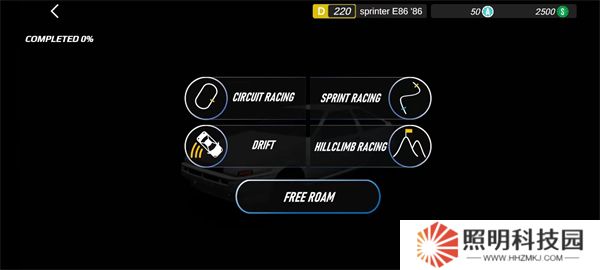 3、進(jìn)入后一共有四種玩法,分別是賽車、短跑、漂移、爬坡比賽。