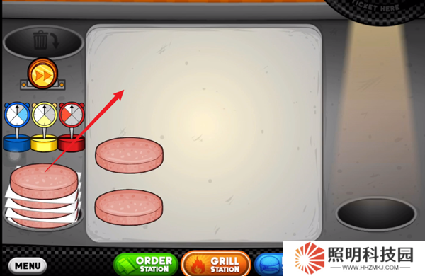 1、玩家們首先需要將自己后廚當中的生肉餅放到烤盤上。