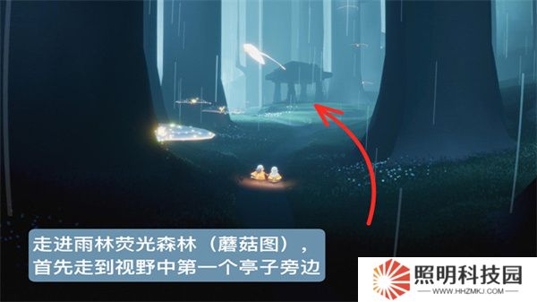 1、首先我們來到雨林熒光森林,走到場景中的第一個亭子那里。