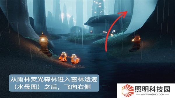 1、首先玩家們控制角色來到雨林密林遺跡,在水母圖往右側飛。