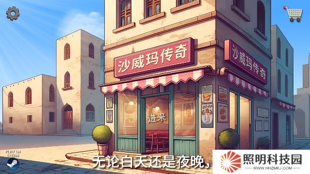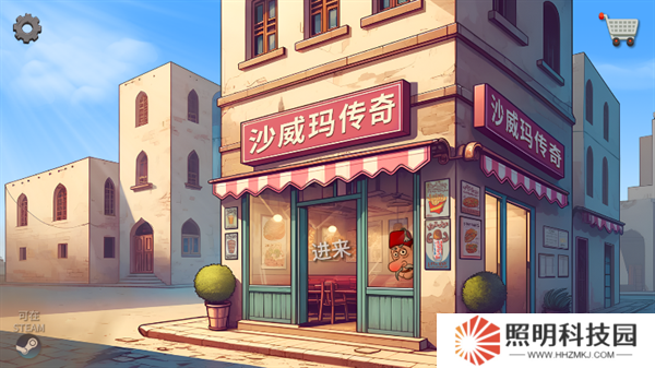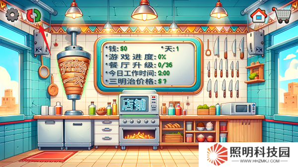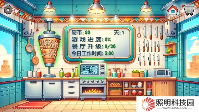 2、然后玩家們就會進入到沙威瑪店鋪的界面當中,你可以點擊店鋪開始進行經營,或者點擊右上角的購物車圖標來購買更多的設備。