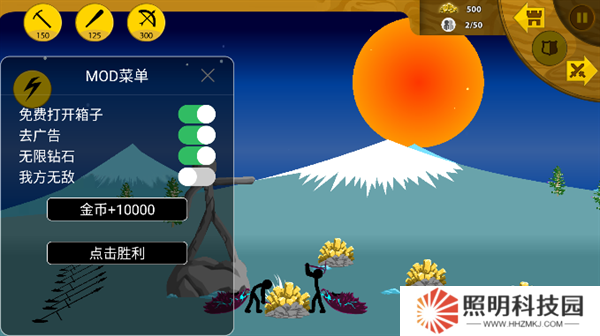2、建造單位,開采金幣,學習劍法,長矛,并訓練弓箭手,巫師,甚至是巨人。