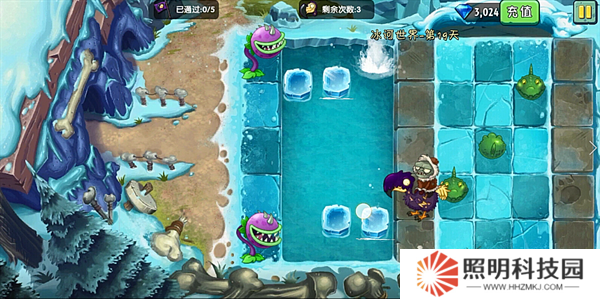 左數第一、二、三列,會出現縱向浮冰,一、三列是從下到上,二列是從上到下。玩家需要踩著浮冰去到對岸,同時也要規避在岸上的食人花。很多人都容易在這里有失誤,導致過關失敗,主要有兩點:浮冰跳躍時機沒有把控好和被大嘴花吃掉。