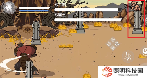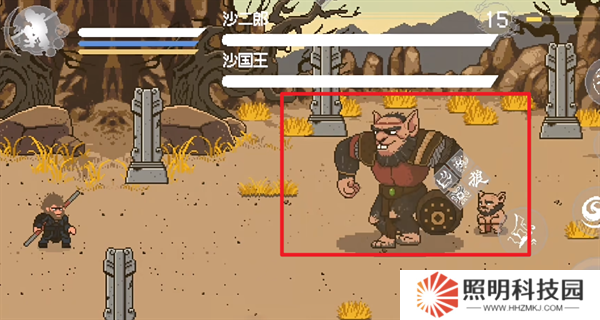 2、沙二郎會近身對玩家發起攻擊,而沙國王則會跳到石柱上面通過扔石塊的方式進行攻擊。