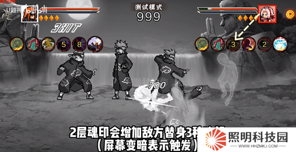 人間道佩恩技能或奧義命中會增加敵方1層封印魂印,2層魂印會增加敵方替身3秒冷卻(屏幕變暗表示觸發(fā)),3層會降低敵方移速5秒(屏幕變暗同時敵方身上有減速特效),4層會造成一次百分比傷害并清空層數(shù)(屏幕反色)。