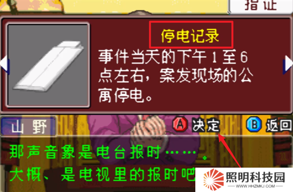 9、完成初步的詢(xún)問(wèn)之后就會(huì)出現(xiàn)證人,此時(shí)你需要通過(guò)證物來(lái)指正對(duì)方的漏洞,死亡時(shí)間選擇【高日美佳的解剖記錄】進(jìn)行反駁。