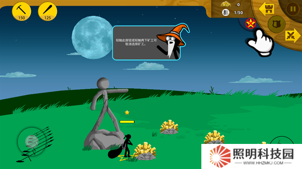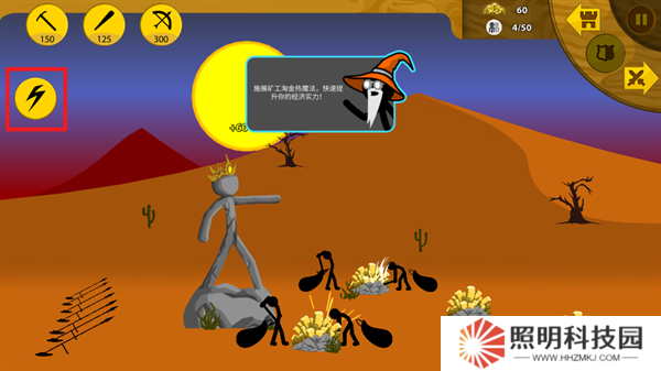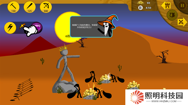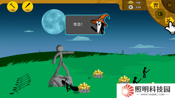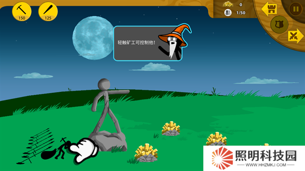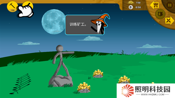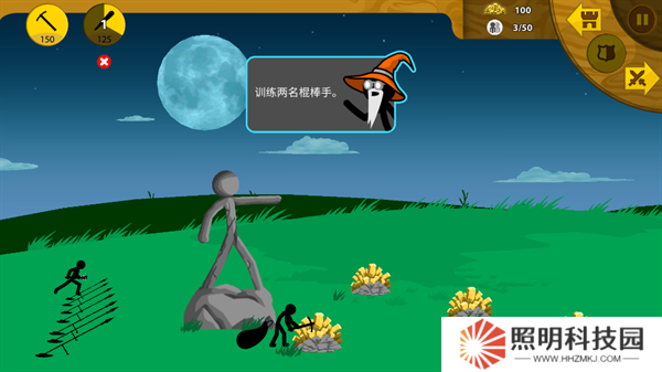 8、礦工幫助**積攢一定的金幣資源之后,就能夠開始進(jìn)行戰(zhàn)斗單位的訓(xùn)練,點(diǎn)擊左上角第二個(gè)圖標(biāo)訓(xùn)練棍棒手。