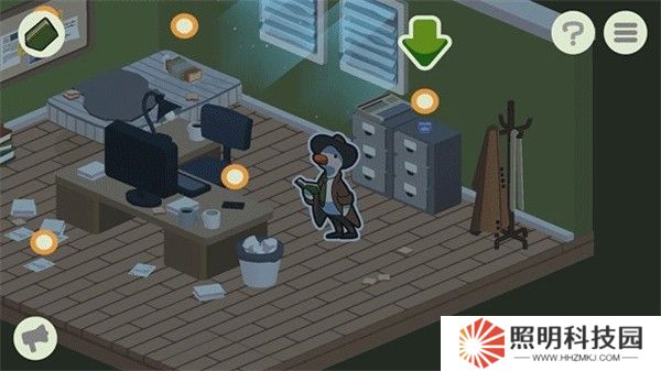 2、點擊屏幕即可控制鴨子偵探移動,當場景中出現黃色圓圈時,點擊它們即可搜尋關鍵線索;