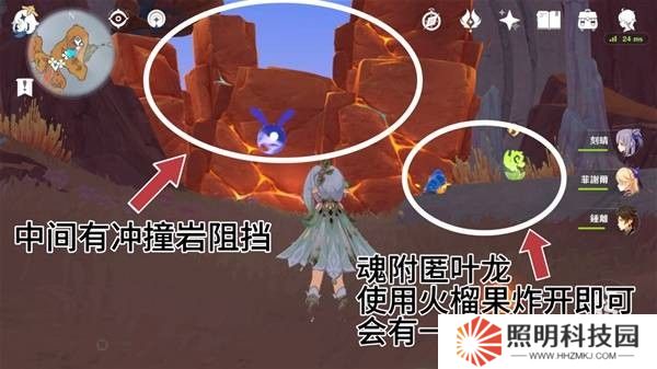 途中會(huì)遇到?jīng)_撞巖阻擋,可以使用基尼奇的技能、魂附匿葉龍,或使用瓦雷莎/伊安珊直接撞碎。清理沖撞巖后,還能獲得一個(gè)普通寶箱!
