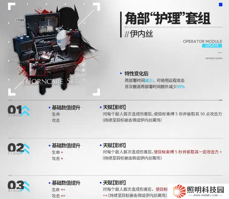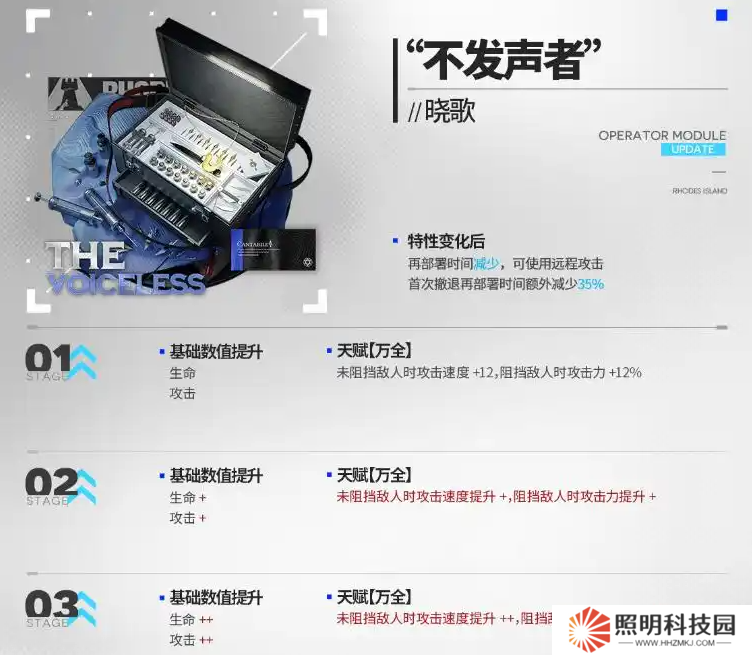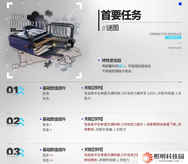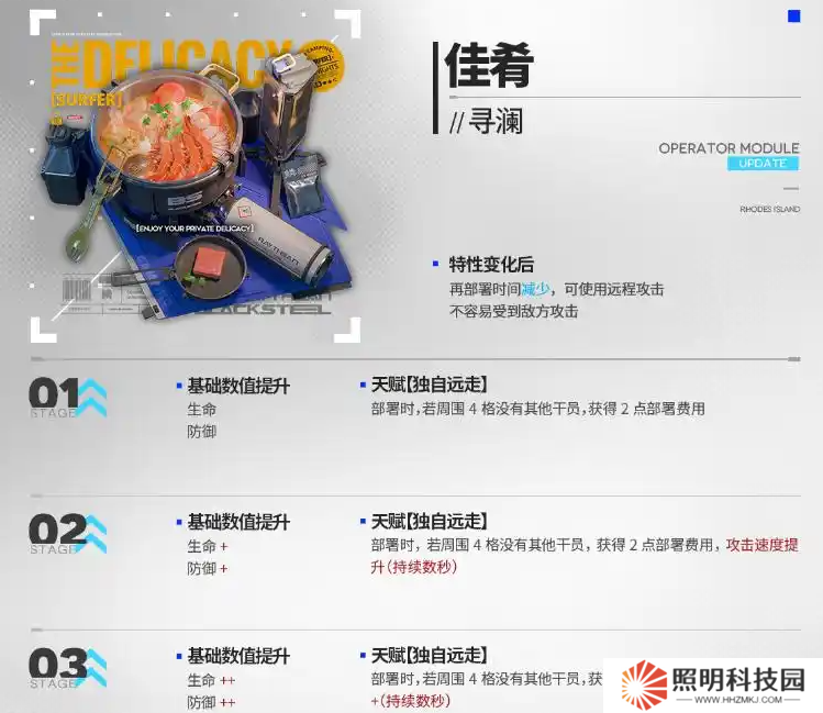 升級效果:部署時,若周圍4格內沒有其他干員,獲得2點部署費用,攻擊速度提升+(持續數秒)