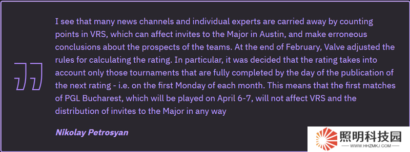 “我看到許多新聞頻道和個別專家熱衷于計算VRS積分,而這些積分可能會影響到奧斯汀Major賽事的參賽邀請,并且他們還對各戰隊的前景得出了錯誤的結論。在2月底,V社調整了排名計算規則。特別是,V社決定排名只考慮在下次排名公布當天(即每個月的第一個星期一)已經完全結束的那些賽事。這意味著,將于4月6日至7日舉行的PGL 布加勒斯特站的首輪比賽,將不會以任何方式影響VRS排名以及奧斯汀Major參賽邀請的分配情況。”