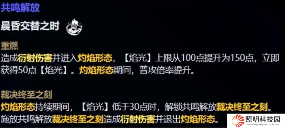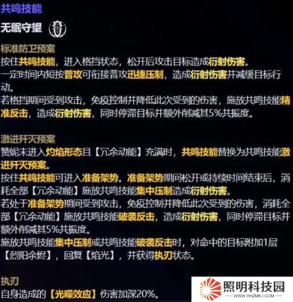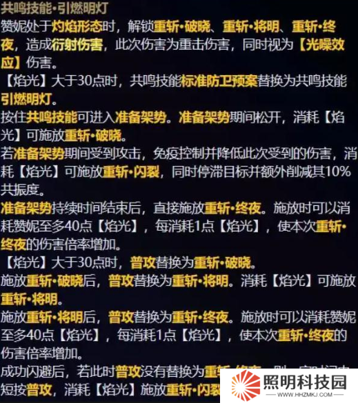 而開(kāi)大招后的第二形態(tài),共鳴技能就發(fā)生變化了,根據(jù)焰光的點(diǎn)數(shù)不同,造成的效果也不一樣,除了格擋之外,這里的主要輸出傷害定位是重?fù)魝Α?/p>